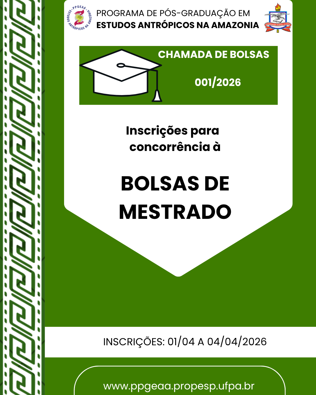A Coordenação do Programa de Pós-Graduação em Estudos Antrópicos na Amazônia anuncia por esta Chamada a inscrição para a concorrência a bolsas de mestrado e composição de cadastro reserva para distribuição cotas provenientes de agências de fomento que disponibilizam bolsas ao Programa.